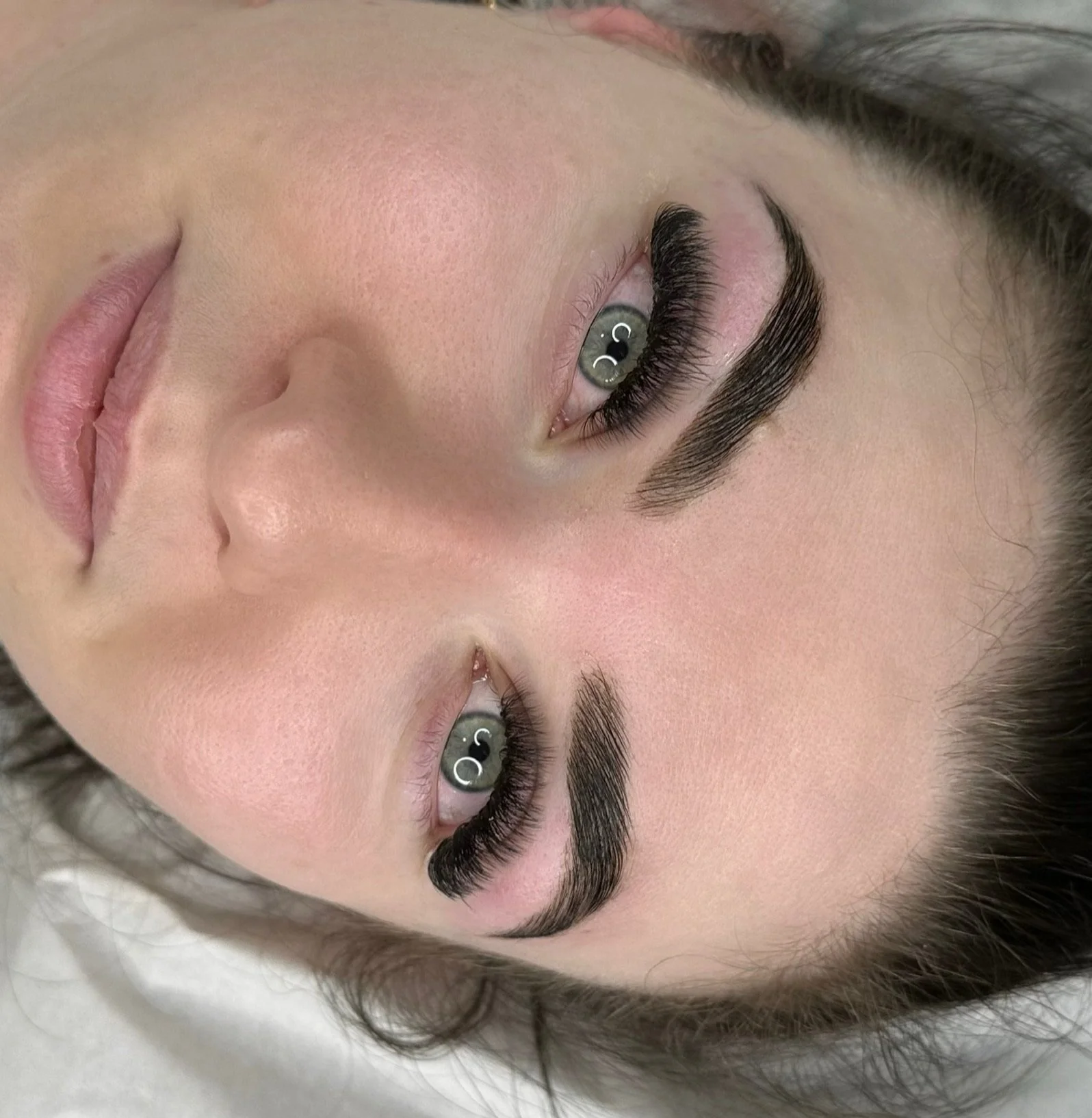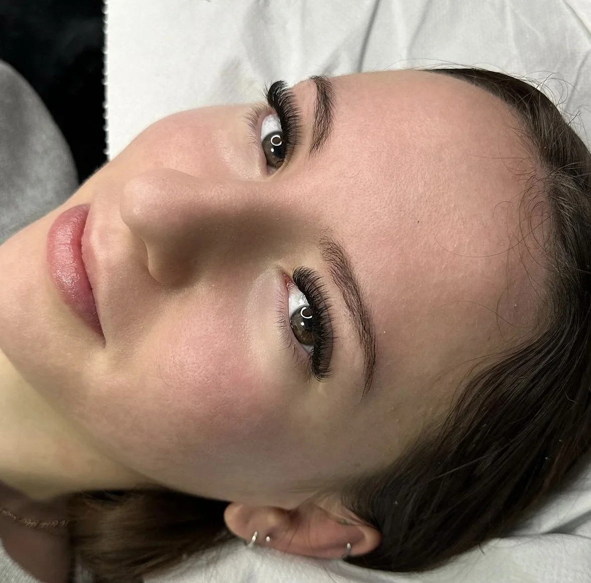 Close-up of a woman's face showing freshly done eyelash extensions, with her eyes closed and her natural eyebrows well-groomed.