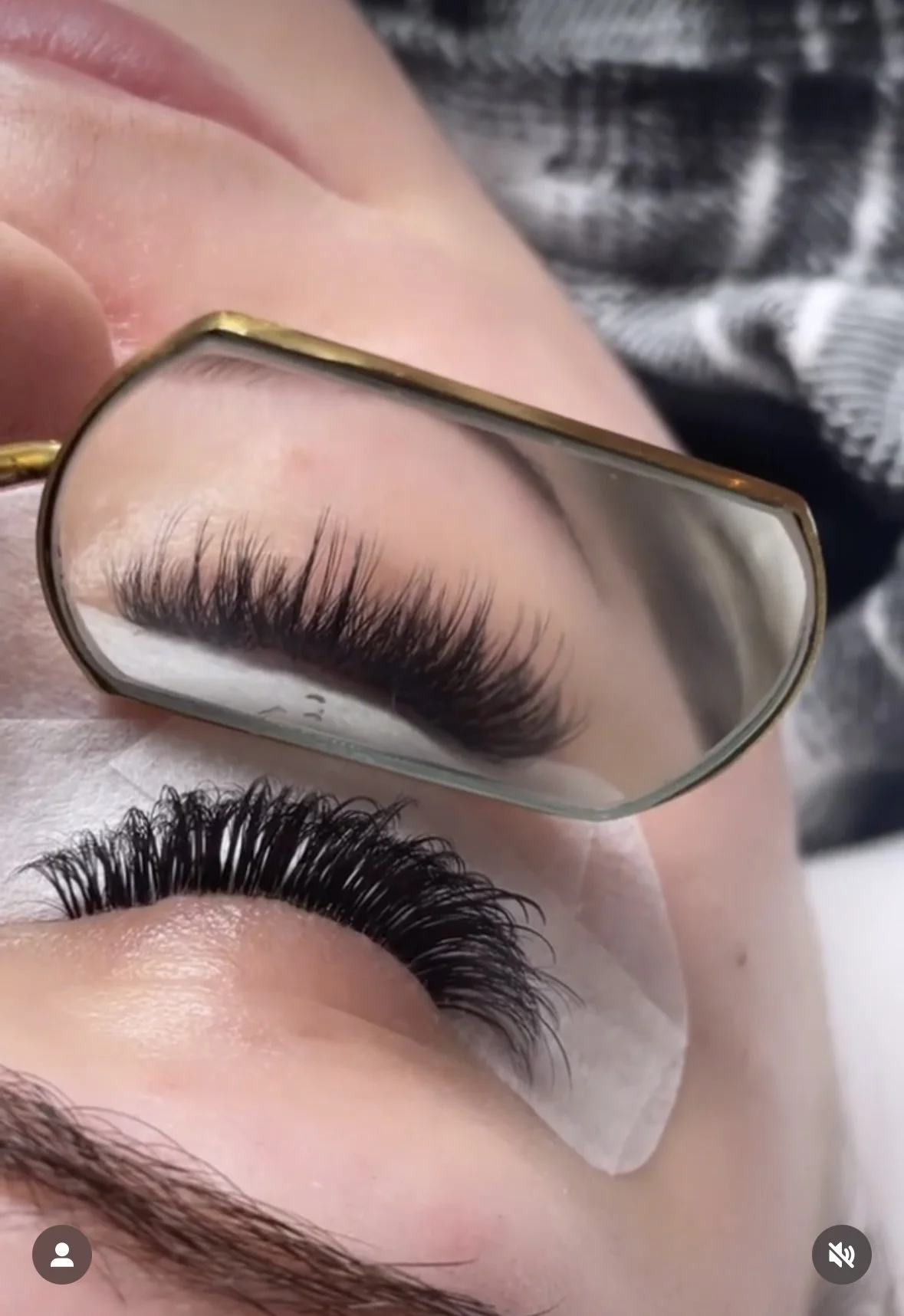 Close-up of a person getting eyelash extensions, with a mirror reflecting the freshly applied long, dark, and curled eyelash extensions.